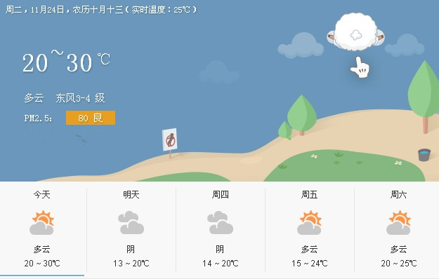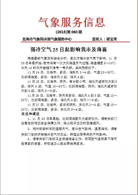 11月24號,北海市,多云,偏東風(fēng)3到4級,最低氣溫23度,最高氣溫30度;25日早晨起,陰天,有分散小雨,偏北風(fēng)逐漸加大到5級,陣風(fēng)6級。