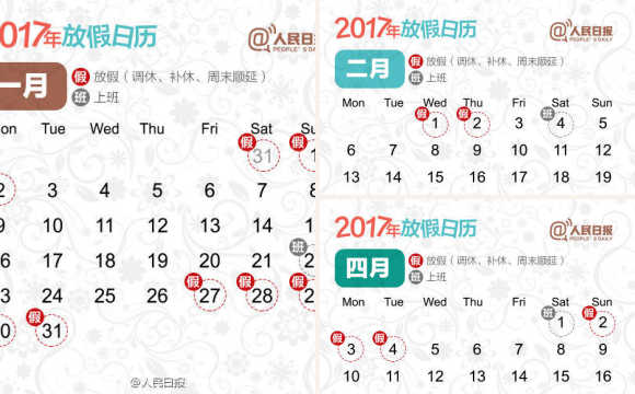 各省、自治區(qū)、直轄市人民政府,國(guó)務(wù)院各部委、各直屬機(jī)構(gòu):經(jīng)國(guó)務(wù)院批準(zhǔn),現(xiàn)將2017年元旦、春節(jié)、清明節(jié)、勞動(dòng)節(jié)、端午節(jié)、中秋節(jié)和國(guó)慶節(jié)放假調(diào)休日期的具體安排通知如下。
