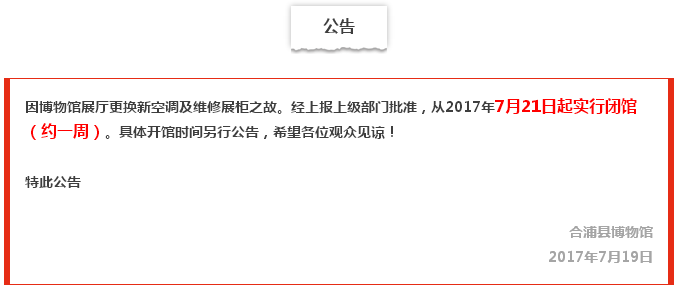 為了更好的保護文物,也為了讓游客能得到更好的游館體驗,7月19日,合浦縣博物館發(fā)出閉館修護公告,市民游客們請注意調(diào)整游館時間,公告全文如下: