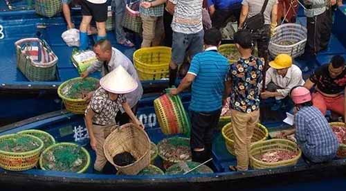 一大早,外沙橋頭,就看到有不少“排仔船”已經(jīng)在出售從出海漁船上裝回的海鮮,進貨的商販們也早早地守候在此。