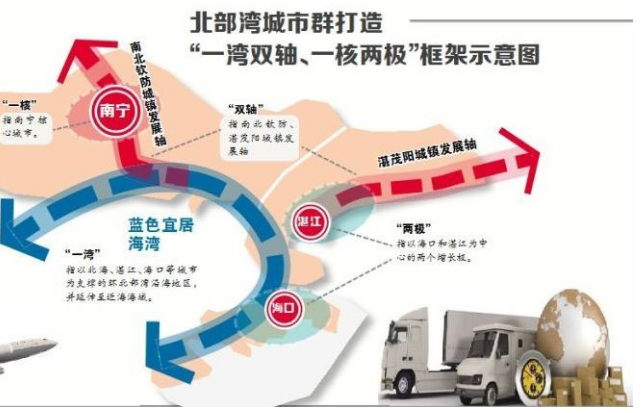重點任務(wù) 以南寧核心城市為支撐,以北海、防城港、欽州、玉林、崇左為重要節(jié)點,構(gòu)建“一灣雙軸、一核兩極”的廣西北部灣城市群框架,促進(jìn)同城化發(fā)展,輻射帶動沿海沿邊城鎮(zhèn),強(qiáng)化陸海空間管控,建設(shè)宜居城市和藍(lán)色海灣城市群。