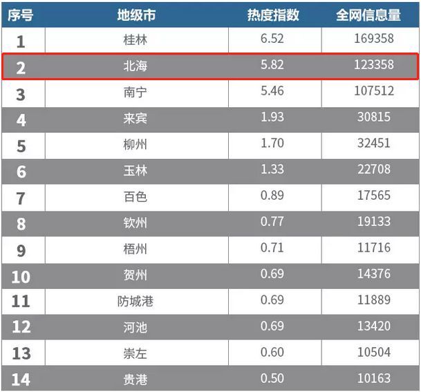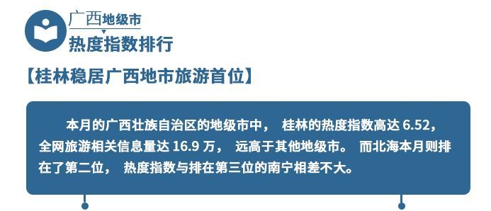 從地級市熱度指數(shù)中可以看出,排名第二的北海受到了較多的關(guān)注。近年來,冬季不淡成為北海旅游的新氣象,良好的空氣生態(tài)和濱海風(fēng)光吸引了國內(nèi)眾多的候鳥老人前來過冬。