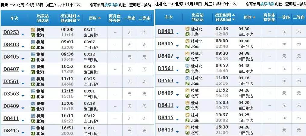 4月18日,桂林、柳州至北海動(dòng)車查詢-12306官網(wǎng)截圖