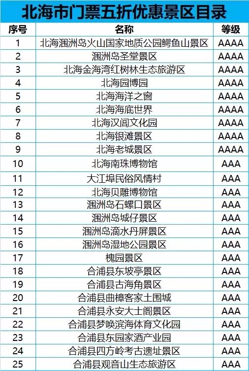 2018年4月12日至2018年5月12日(4月29日至5月1日三天五一假除外),福建、廣東、廣西、貴州、海南、湖南、江西、四川、云南、香港和澳門特別行政區(qū)等11個(gè)地區(qū)游客憑居民身份證,港澳居民來往內(nèi)地通行證,可享受北海25家A級景區(qū)門票5折優(yōu)惠(不包括溫泉、游樂園和景區(qū)內(nèi)索道、游船等其他特許經(jīng)營性項(xiàng)目)。也就是說,北海人也能享受到門票五折優(yōu)惠福利!