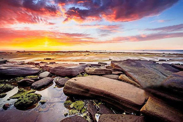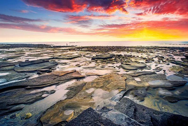 五彩灘景區(qū)位于潿洲島東海岸,景區(qū)內(nèi)有長達(dá)1.5公里的海岸,海蝕平臺在海蝕崖前展布,平坦而寬闊,在海蝕崖與海蝕平臺的交界處形態(tài)各異的海蝕洞隨處可見。