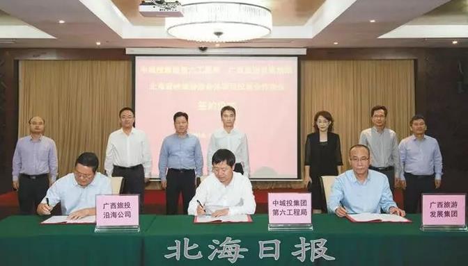 廣西旅游發(fā)展集團(tuán)有限公司副總經(jīng)理、總法律顧問陳銘釗,廣西旅游投資集團(tuán)沿海投資開發(fā)有限公司董事長(zhǎng)羅奕軍和中國城投建設(shè)集團(tuán)第六工程局廣西分公司總經(jīng)理韋永余分別代表三方簽約。
