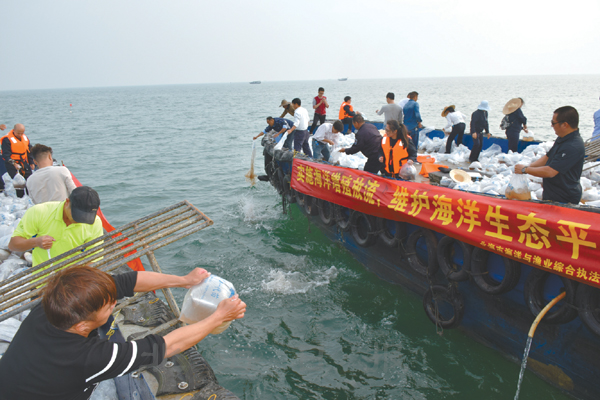 海洋與漁業(yè)局在銀灘南部海域進行增殖放流活動。