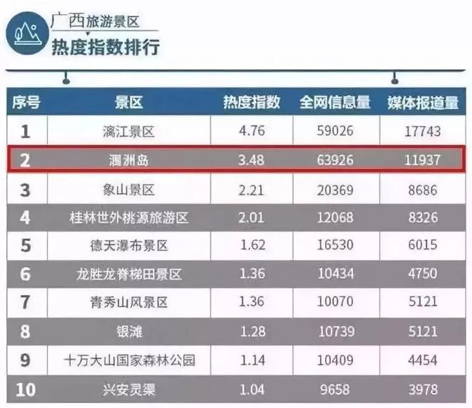 在廣西50多個旅游景區(qū)熱度指數(shù)排行中,潿洲島位居第二名!熱度指數(shù)達(dá)3.48全網(wǎng)信息量達(dá)63926,媒體報道量達(dá)11937,較上月上升197%