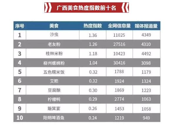 近日,新浪微輿情大數(shù)據(jù)平臺(tái)發(fā)布《2019年5月廣西旅游行業(yè)數(shù)據(jù)報(bào)告》在廣西美食熱度指數(shù)排行中北海”沙蟲(chóng)“超越“老友粉”和“桂林米粉”躍居5月份排行榜之首!該榜單顯示沙蟲(chóng)熱度指數(shù)為1.36全網(wǎng)信息量為11025,媒體報(bào)道量為4349均高于其他美食.