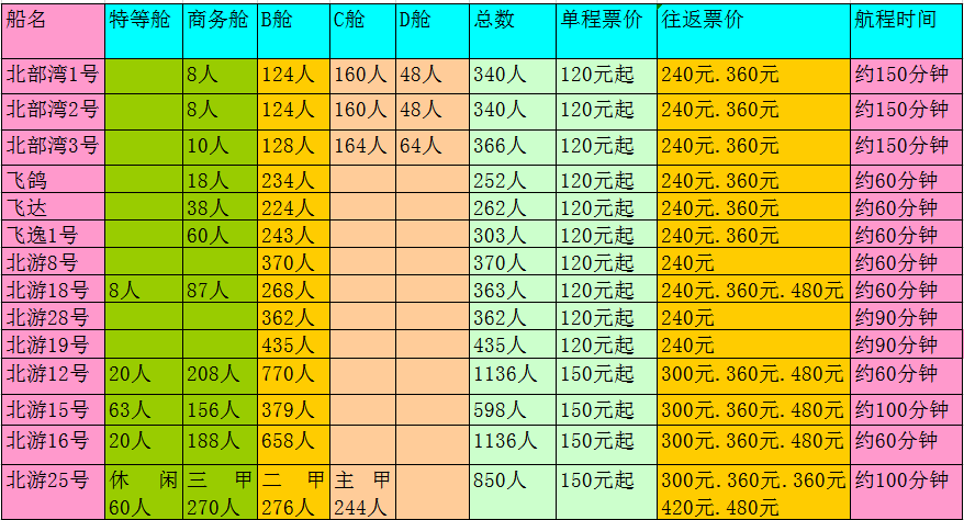 北游8號,北游19號,北游28號,B等艙(位于一樓)120/人