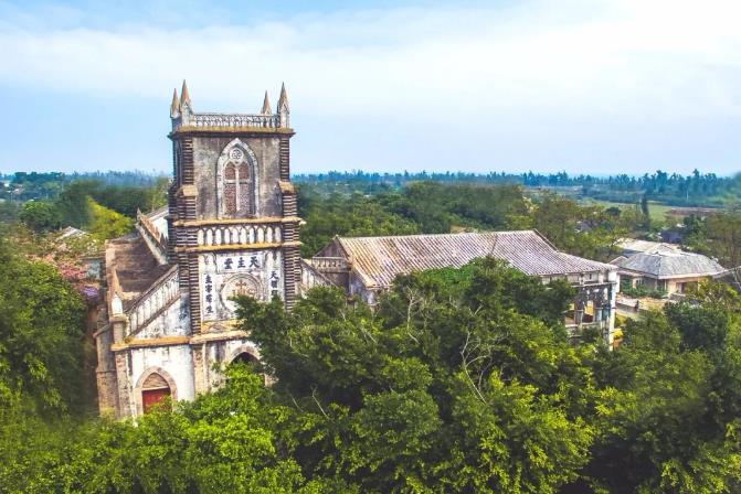潿洲島天主教堂由法國(guó)巴黎傳教士于1853年始建,歷時(shí)十年建成,主體建筑保護(hù)較為完好,是我國(guó)現(xiàn)存幾座最早且規(guī)模較大的天主教堂之一,也是中西文化融合共生的歷史見(jiàn)證,具有典型的文化復(fù)興時(shí)期法國(guó)哥特式建筑風(fēng)格。
