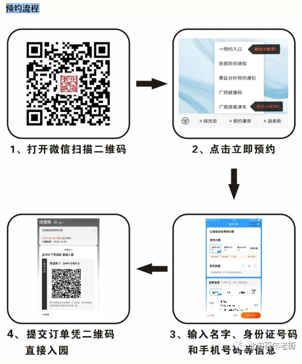 1、10月1日至8日景區(qū)實(shí)行門票分時(shí)預(yù)約制度,游客需提前在網(wǎng)上預(yù)約門票(免費(fèi)),出示預(yù)約門票二維碼,直接入園,無需取票。游客可通過“北海百年老街”官方微信公眾號、廣西直通車、美團(tuán)等小程序、電商平臺(tái)進(jìn)行預(yù)約。