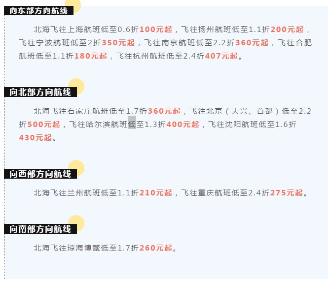 近來(lái),在北海機(jī)場(chǎng)投入運(yùn)力的航空公司結(jié)合冬季"候鳥(niǎo)”人群探親訪友往來(lái)密切的特點(diǎn),紛紛推出了航空出行優(yōu)惠票價(jià),特別為北海市民元旦假日出行加大了優(yōu)惠力度,讓機(jī)票價(jià)格更親民!南方航空、春秋航空、國(guó)際航空、吉祥航空等多家航空公司為回饋廣大市民,方便市民旅游、探親和返家,截止至12月末部分航線在年末放出今年以來(lái)最優(yōu)惠票價(jià)。(以下機(jī)票價(jià)格均不含民航發(fā)展基金稅)北海機(jī)場(chǎng)溫馨提醒