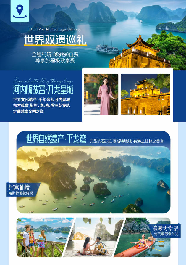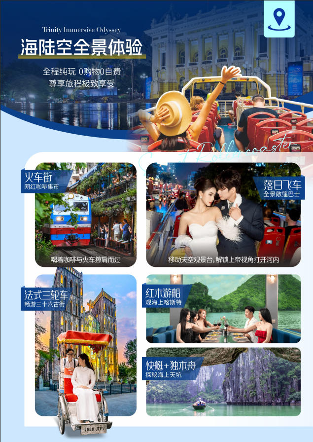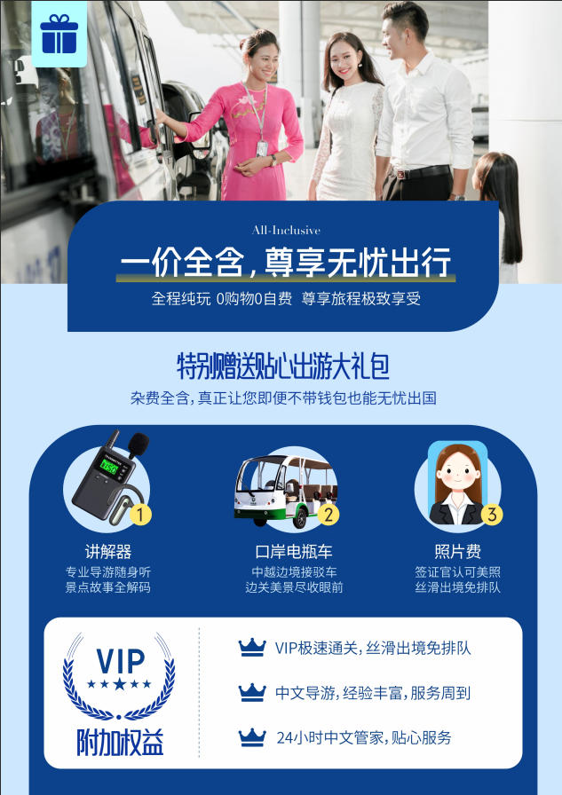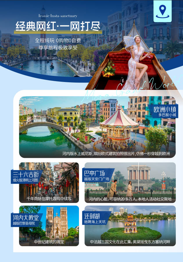 4、景點(diǎn):行程中所列景點(diǎn)首道門(mén)票;特別聲明:行程中“印象越南表演、 天堂島、月亮湖、迷宮、巡州島”均為我社特別贈(zèng)送項(xiàng)目,如不可抗力因素不能游覽或游客不參與游覽,亦無(wú)費(fèi)用減退