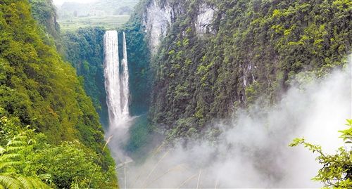 通靈大瀑布跌落的深潭邊有一個(gè)巨大的溶洞,洞內(nèi)景色奇異,一條高達(dá)20多米的瀑布從溶洞上方沿巖壁飛流直下,呈九級(jí)跌落,匯入鴛鴦潭,與大瀑布一起消失在深不可測的地下河里。
