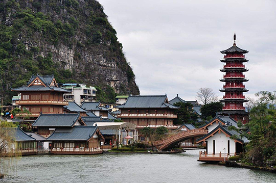 環(huán)碧園:在疊彩山北白鶴洞下,與仙鶴洞相通。因"滿(mǎn)園碧翠,環(huán)顧可得"而名,是清代桂林畫(huà)家李秉綬所建,也叫李園;園中建筑遍布,有亭、臺(tái)、堂、榭、圃、廊10余處,成為一代名園。