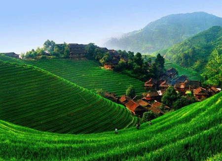 龍脊梯田距龍勝縣城27公里,距桂林市80公里,景區(qū)面積共66平方公里,梯田分布在海拔300至1100米之間,坡度大多在26至35度之間,最大坡度達(dá)50度。雖然南國山區(qū)處處有梯田,可是象龍脊梯田這樣規(guī)模的實(shí)屬罕見。龍脊梯田始建于元朝,完工于清初,距今已有650多年歷史。龍脊開山造田的祖先們當(dāng)初沒有想到,他們用血汗和生命開出來的梯田,竟變成了如此嫵媚瀟灑的曲線世界。在漫長(zhǎng)的歲月中,人們?cè)诖笞匀恢星笊娴膱?jiān)強(qiáng)意志,在認(rèn)識(shí)自然和建設(shè)家園中所表現(xiàn)的智慧和力量,在這里被充分地體現(xiàn)出來。