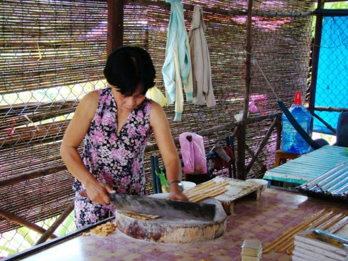 越南民風(fēng)的厚道被表現(xiàn)得淋漓盡致。上了水果島,更像是到了水果加工廠。因為島上長著火龍果、紅毛丹、椰子、柚子、香蕉等水果,隔不遠(yuǎn)就是一個小加工廠,向游客全面展示水果糖、椰木雕等的制作過程,水果大餐當(dāng)然更是必不可少的一道程序。