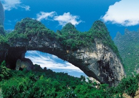 月亮山公園以直徑約20 米形如明月的天然山洞穿過高高的山頭而得名。月亮山海拔380米 ,相對高度230米 ,長410米 ,寬 220米 ,山體面積9.02公頃。1981年筑登山道,800 余級,陽朔大理石鋪成,直達月洞;洞高、寬約50米 ,形如半圓拱門;山壁卻只有幾米厚,洞壁平整似墻,洞頂拄滿形態(tài)各異的鐘乳石。